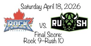 Overtime started with empty possessions for both teams. On Saskatchewan’s second opportunity, Haley became the hero. He caught a pass from Ryan Keenan (5A) high in the zone and fired a low shot that hit nothing but net. Final Score: Toronto Rock – 9, Saskatchewan Rush – 10.