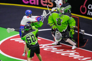 The slow-roll Rush comeback started in the third quarter, where they outscored the Rock 3-2. In the back-and-forth frame, Saskatchewan scored first and last. Manns struck first, 28 minutes and 5 seconds after the last Rush goal. With 9:36 left in the third, he circled around the zone before firing an overhand shot that went bar down over Rose’s shoulder. The celebration was short-lived, as Nicholas Rowlett (1G) took the ensuing faceoff in himself unassisted for a quick goal. The floodgates remained open. Thirteen seconds later, Haley scored for the Rush with a dunk from behind the net after the under-10 TV timeout. The frenzy calmed down for a few minutes before Brad Kri (1G) scored his first goal of the season in transition, stretching the Rock lead back to three. But off the next faceoff, Jake Naso (2G) won it to himself, ran around the zone, and fired after being left open. His goal cut the deficit back to two. At the end of the third quarter, Toronto led Saskatchewan 7-5.