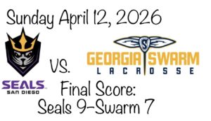 The San Diego Seals (7-9) headed east to face the Georgia Swarm (10-6) for a matinee game on Sunday April 12, 2026. The Swarm wanted a win so they could remain higher up in the standings, while the Seals were in a battle for a playoff berth as a win could put them into eighth place, the cut off for the playoffs.  The Swarm have been inconsistent in scoring this season which allowed San Diego to use a strong first half and a balanced offensive effort to hold the Swarm to just seven goals.  The Seals would control possession throughout the night and capitalize on key power-play opportunities while holding off a late fourth-quarter push from Georgia.  Final Score:  Seals 9—Swarm 7.
